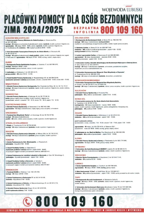 Pod numerem telefonu 800 109 160 można uzyskać informacje o miejscach noclegowych, posiłkach, ubraniach i innych formach pomocy. Infolinia jest bezpłatna i dostępna od 01.11.2024 r.