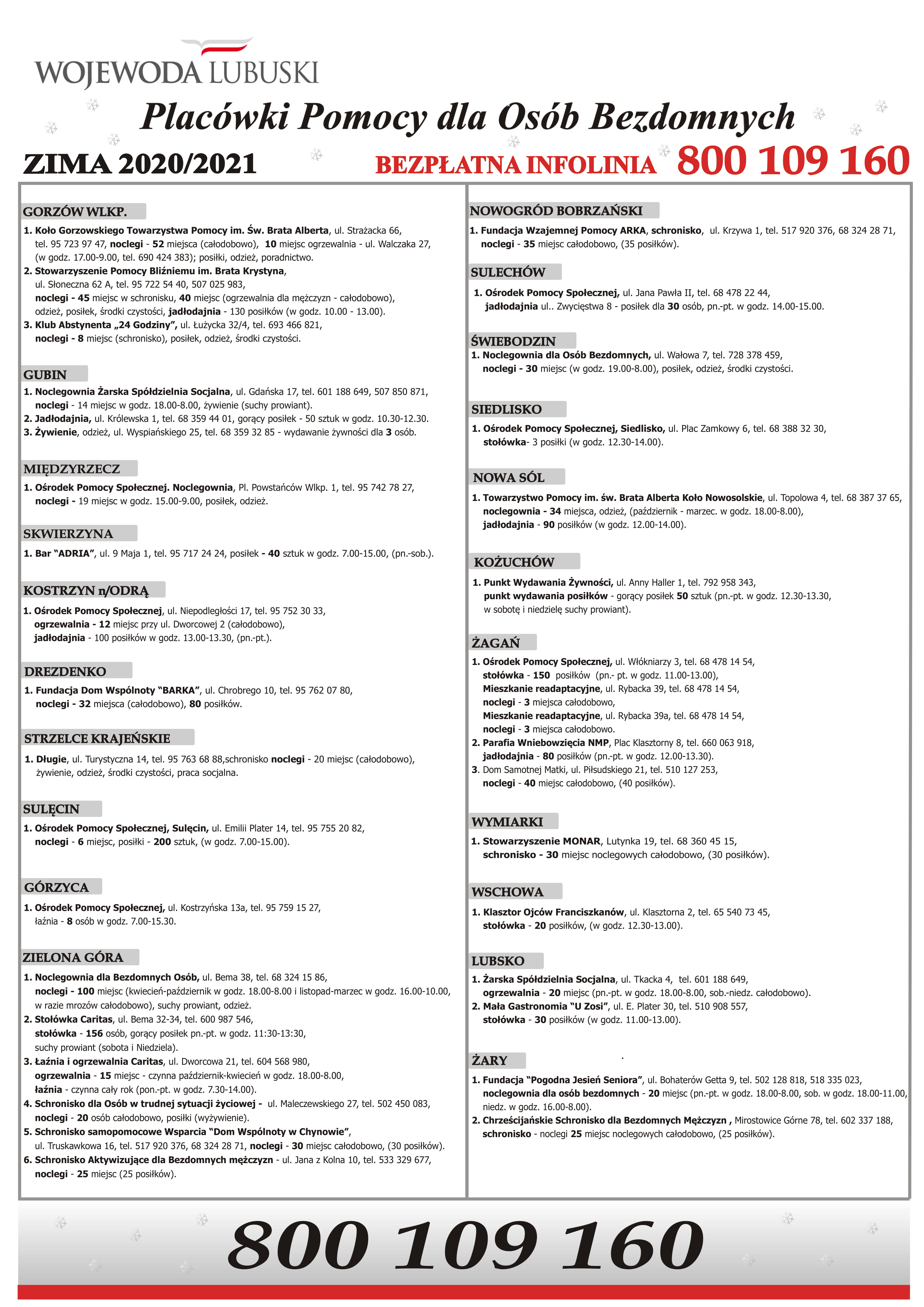 plakat z placówkami dla bezdomnych 2020 na 2021 lubuski urząd wojewódzki